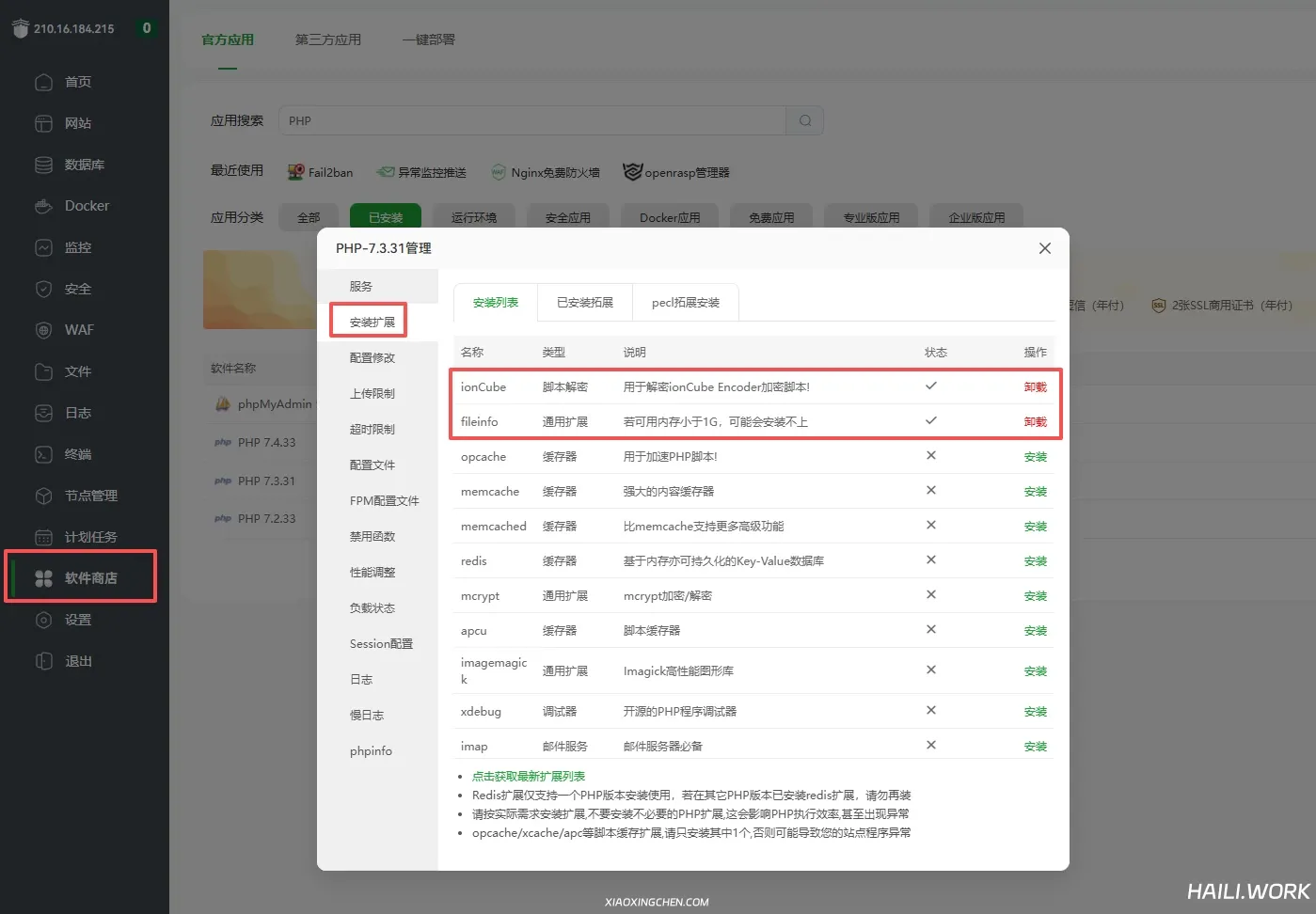 操作步骤:软件商店 ➡️ PHP7.3 ➡️ 设置 ➡️ 安装扩展