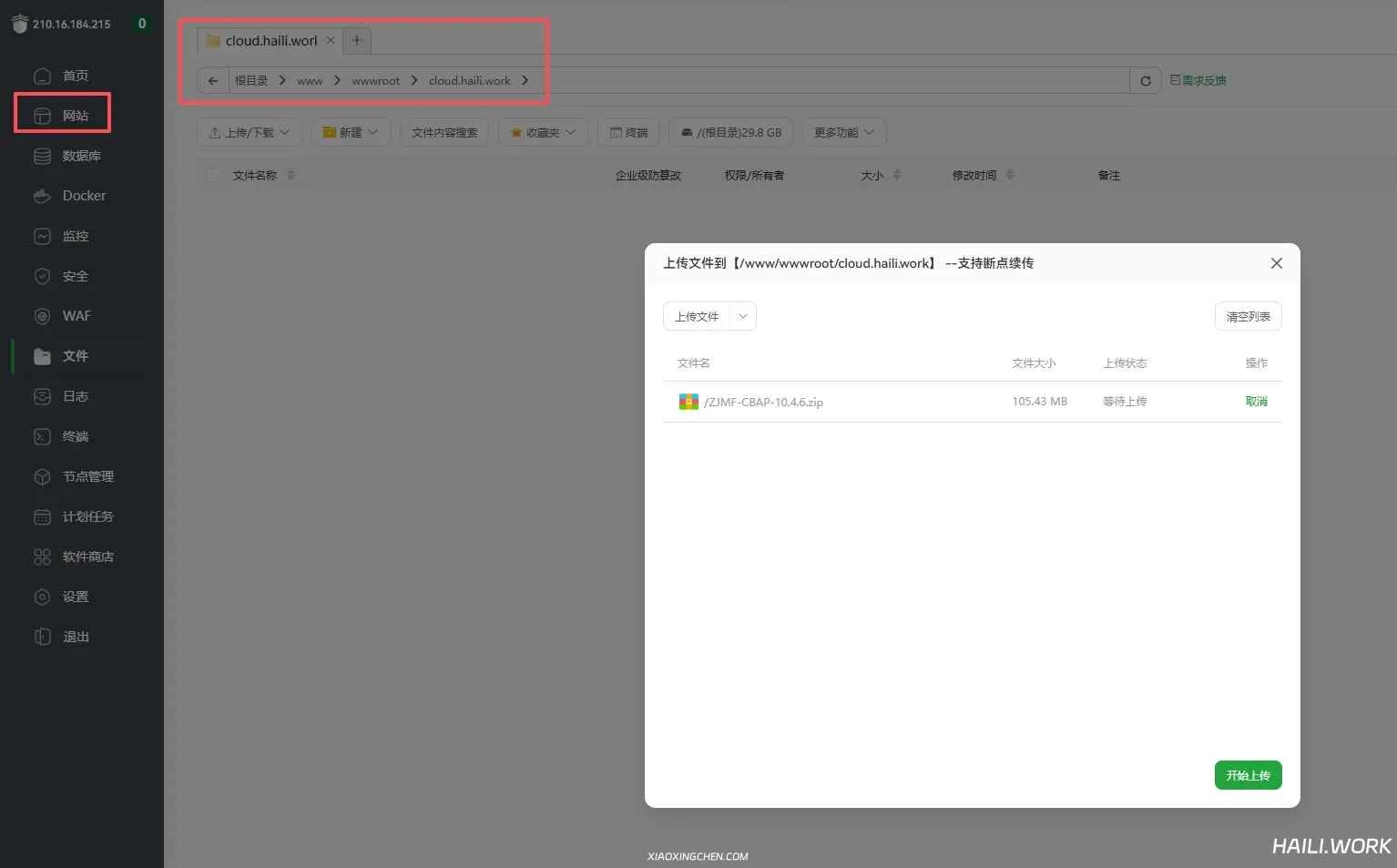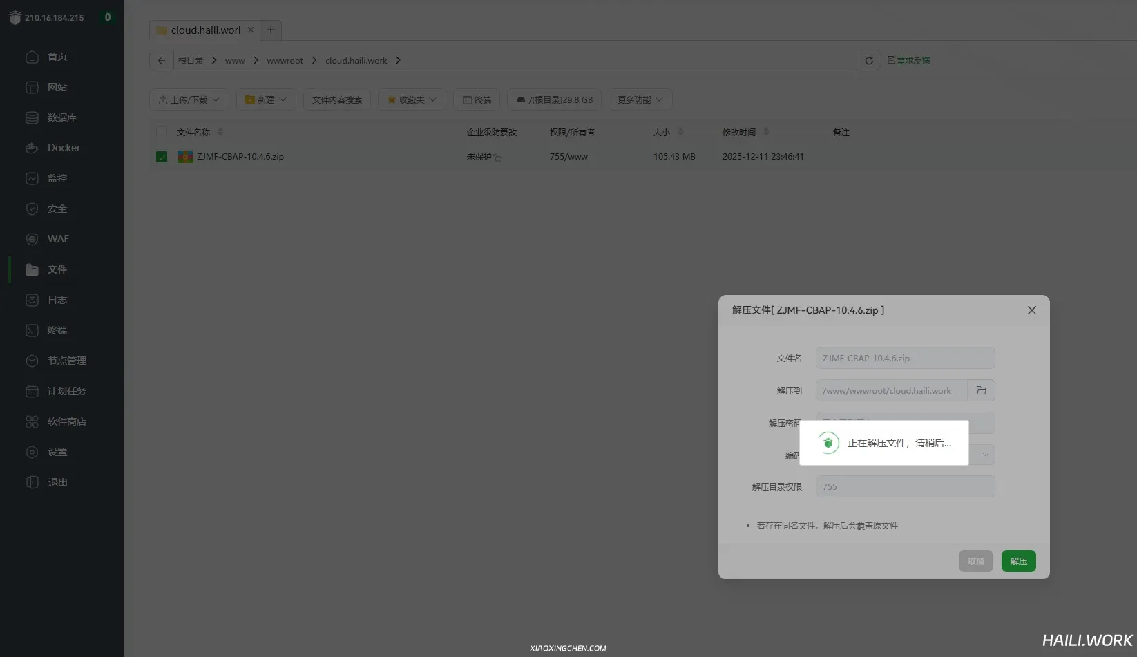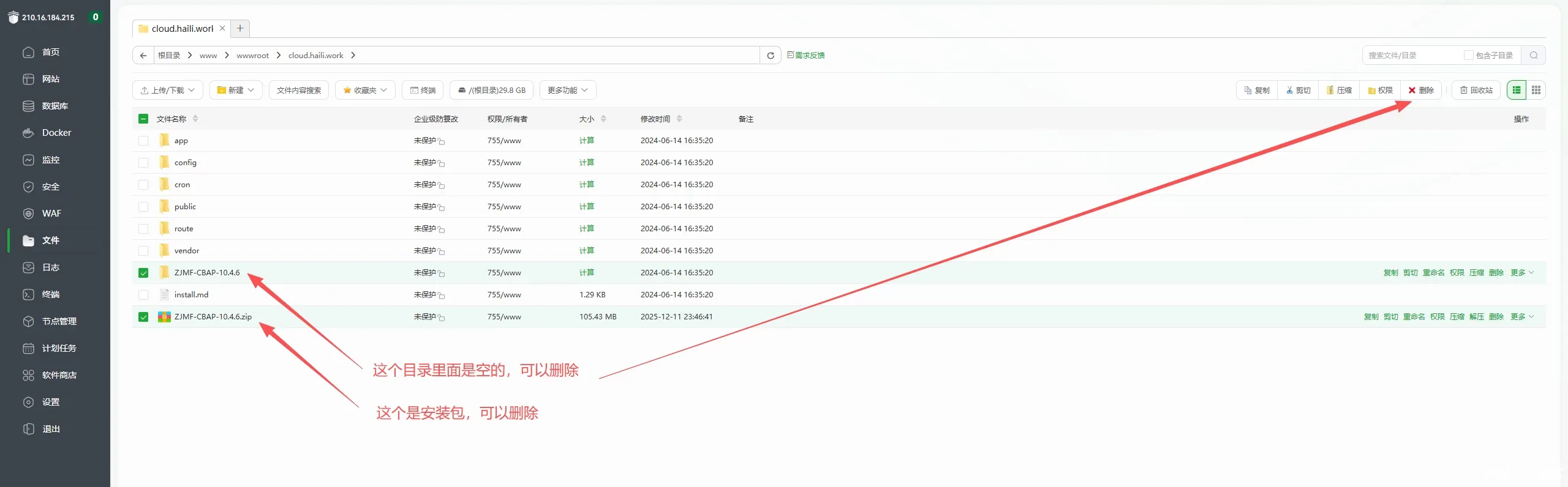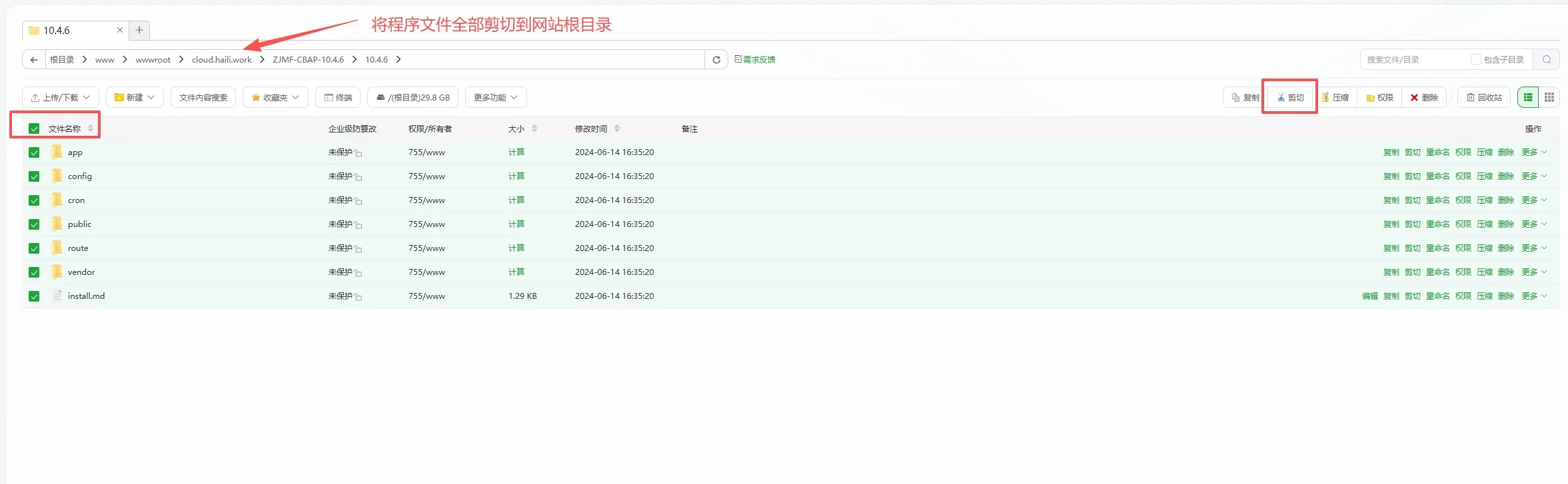将V10 业务管理系统安装包上传到 服务器目录/www/wwwroot/网站目录,并进行解压。