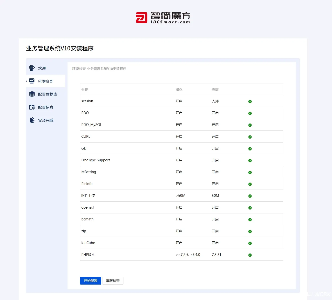 根据官方文档说明,PHP必须安装ionCube、fileinfo扩展,否则将无法正常部署V10业务管理系统。