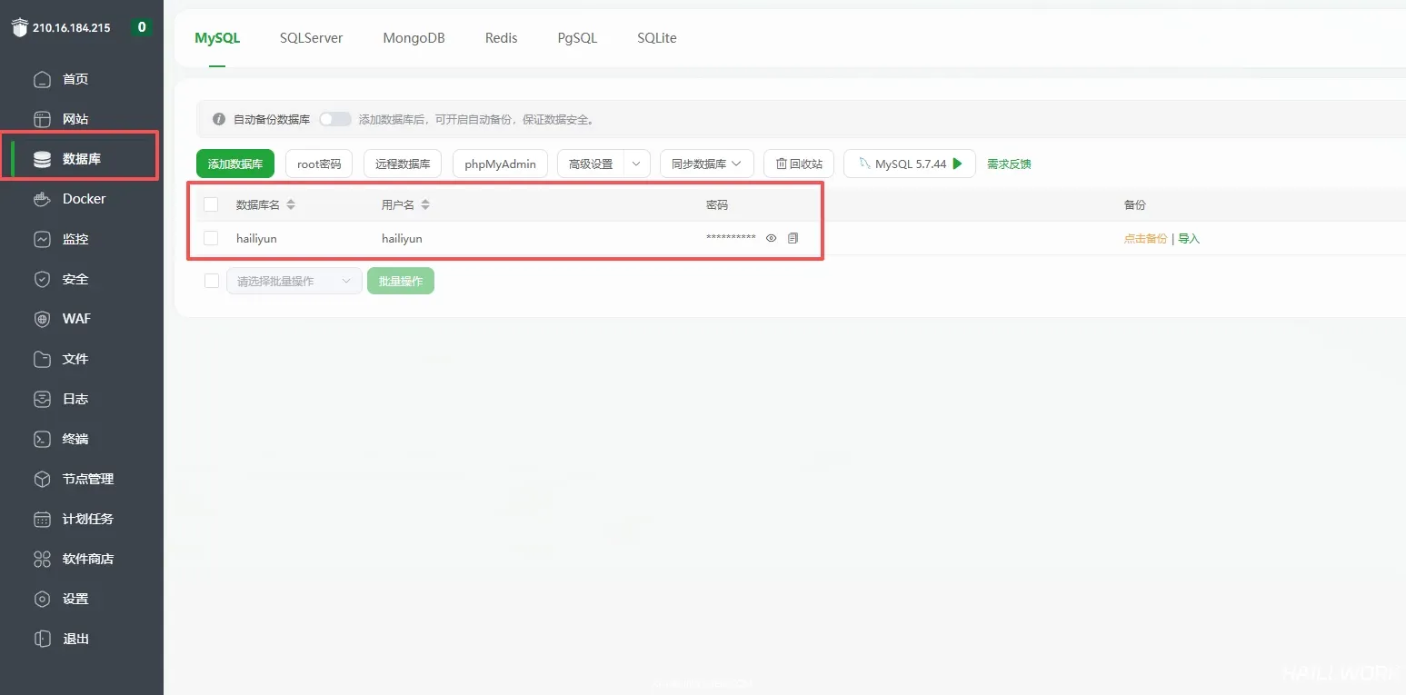 填写刚刚创建站时显示的数据库名和密码,如若忘记保存可前往 [宝塔面板 → 数据库] 查看。