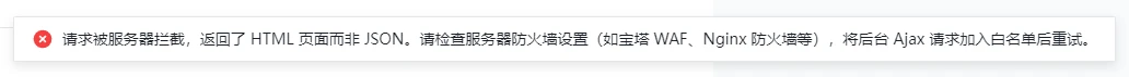 在修改AeroCore主题设置时显示上方报错,报错显示是服务器拦截了后台Ajax请求导致设置保存失败。需要将Ajax请求添加至白名单才可以。那么本文下方会从新手小白的角度来排查验证解决故障现象。