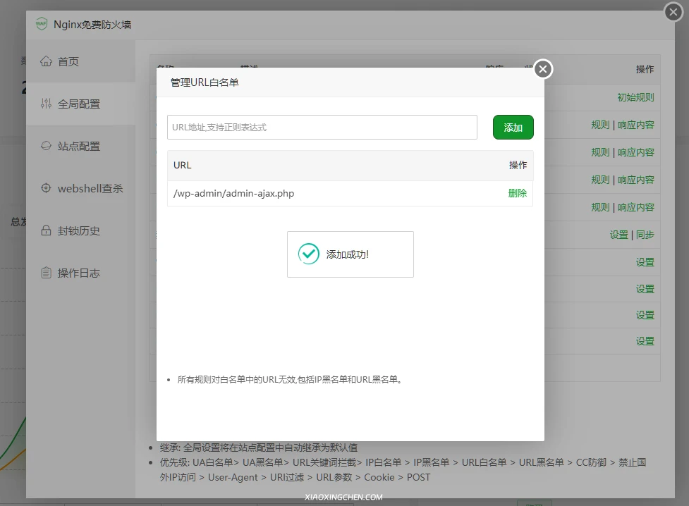 我这里使用的是宝塔的Nginx免费防火墙,白名单添加操作路径为:Nginx免费防火墙 → 全局配置 → URL白名单 → 设置。