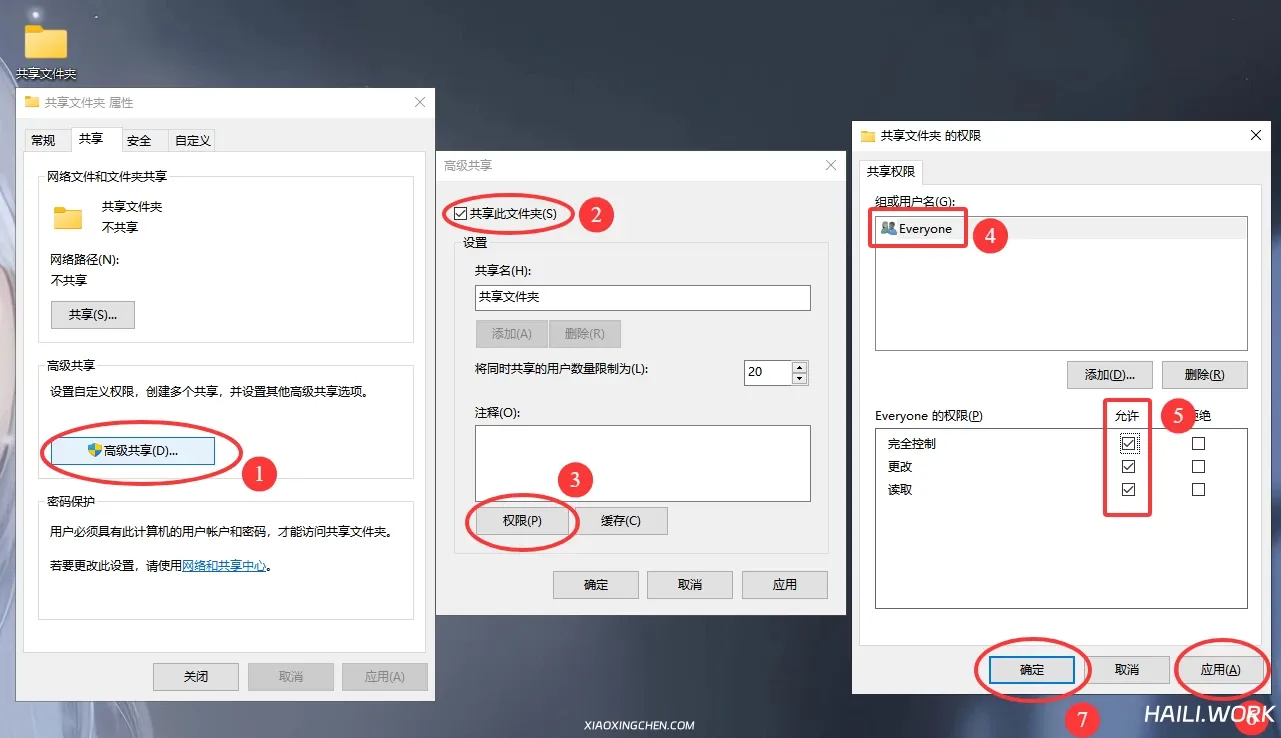 2.点击共享 ,勾选共享此文件夹 ,点击权限 ,选中Everyone 用户,分配完全控制的允许权限,设置完成后点击应用并确认。