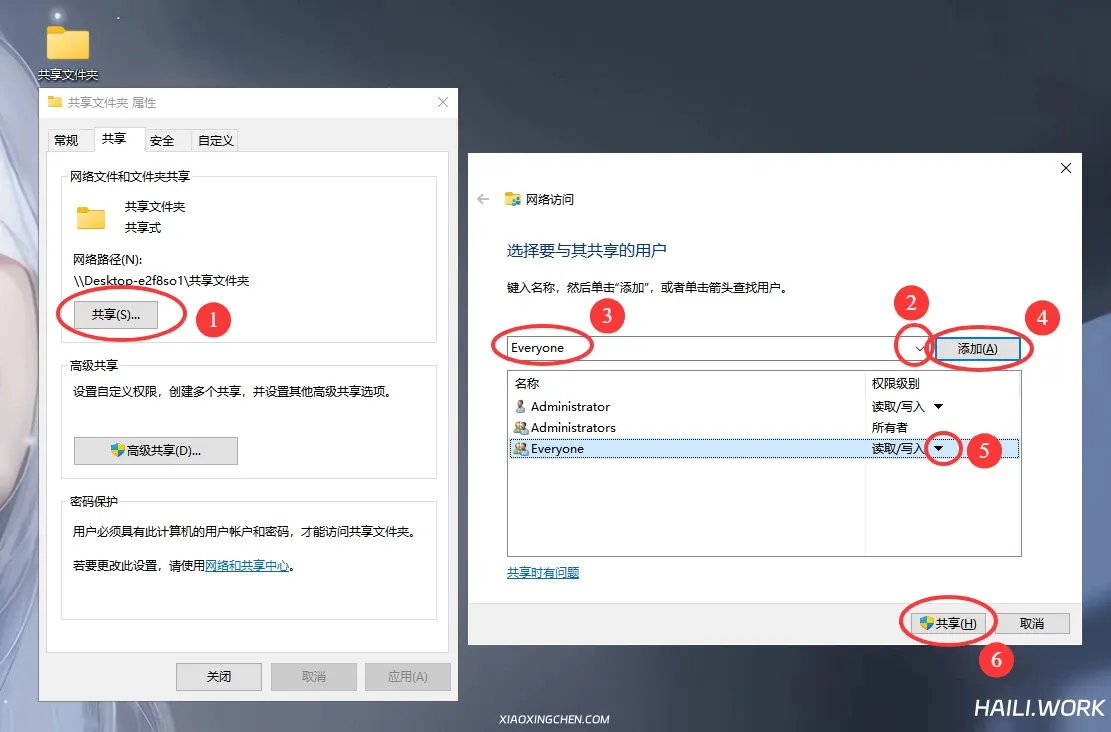 3.点击 共享 ,选择Everyone 用户,点击添加 ,修改用户权限为读取/写入 ,点击共享 即可。