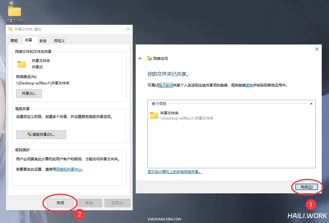 4.点击完成 ,点击关闭 ,这时候你电脑上的共享设置就已经完成了。
