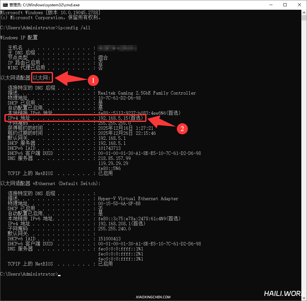 2.1、如果你的网卡没有设置固定IP,而是采用自动获取的形式来让路由器的DHCP分配IP,可能会导致一段时间IP地址变更后手机无法连接,你可以通过修改网卡配置IPv4的获取方式来固定IP,或重新执行ipconfig /all ,来重新获取一下你的电脑IP(比如获取到的新IP是192.168.1.200),那么手机连接服务器的时候就需要修改成192.168.1.200