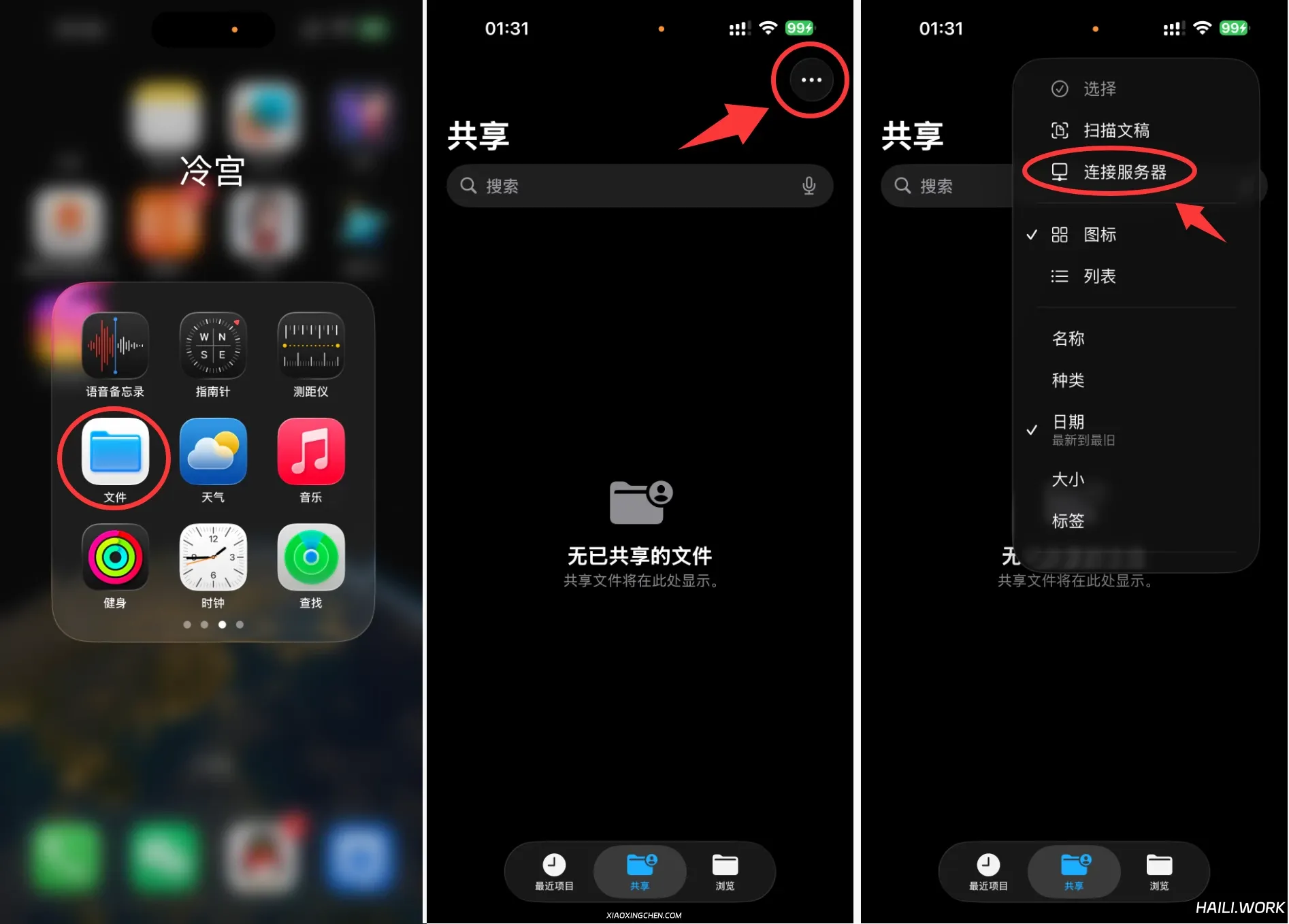 1、打开苹果手机自带的文件App ,点击右上角的三小点 按钮,点击连接服务器 。